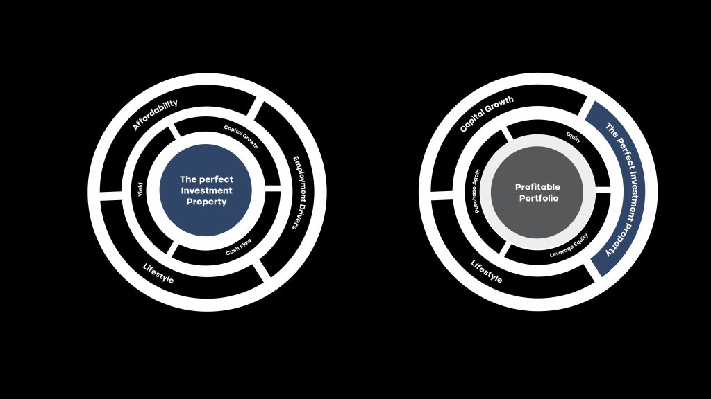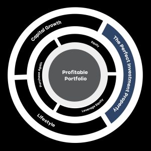 Start with identifying the right property based on external drivers. This will lead to results in the internal circle, leading to the 'perfect investment property'. Now, using this property as a steppingstone, begin the process of equity creation, leverage, and reinvestment, and watch as your portfolio grows profitably.
